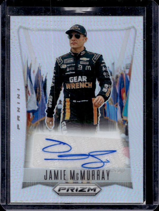 The Jamie McMurray 2024 Prizm NASCAR #TS-JMY Throwback Signatures - Silver card is 1 of 78 Jamie McMurray's card variations in the 2024 Prizm NASCAR set being tracked by Sports Card Investor, including Base, Blue Ice, Green, Green Ice, and Red Ice.
