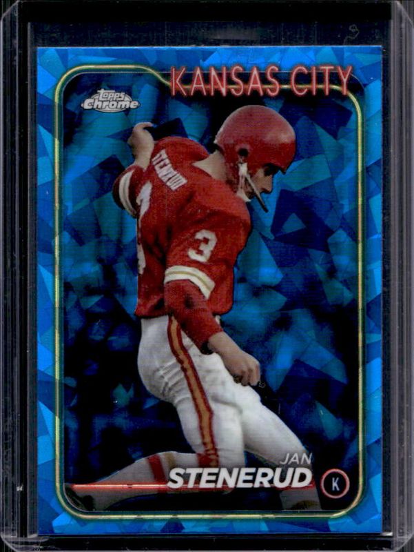 The Jan Stenerud 2024 Topps Chrome Sapphire Edition #98 Base card is 1 of 12 Jan Stenerud's card variations in the 2024 Topps Chrome Sapphire Edition set being tracked by Sports Card Investor, including Gold /50, Orange /25, White /15, Purple /10, and Red /5.