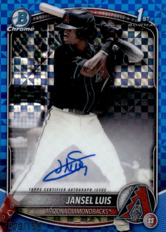 The Jansel Luis 2025 Bowman #CPA-JLU Chrome Prospect Auto - Blue X-Fractor /150 (1st) card in Raw condition has moved up $8.01 (+22.9%) in the last 30 days and was last sold for $43.00 .