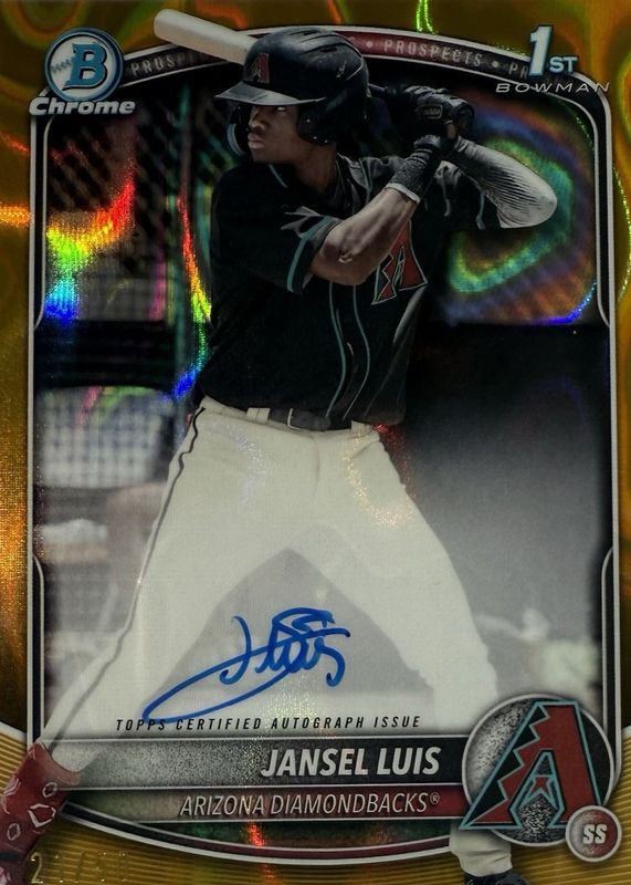 The Jansel Luis 2025 Bowman #CPA-JLU Chrome Prospect Auto - Gold Lava Refractor /50 (1st) card in Raw condition has not changed in price in the last 30 days and was last sold for $89.76 .