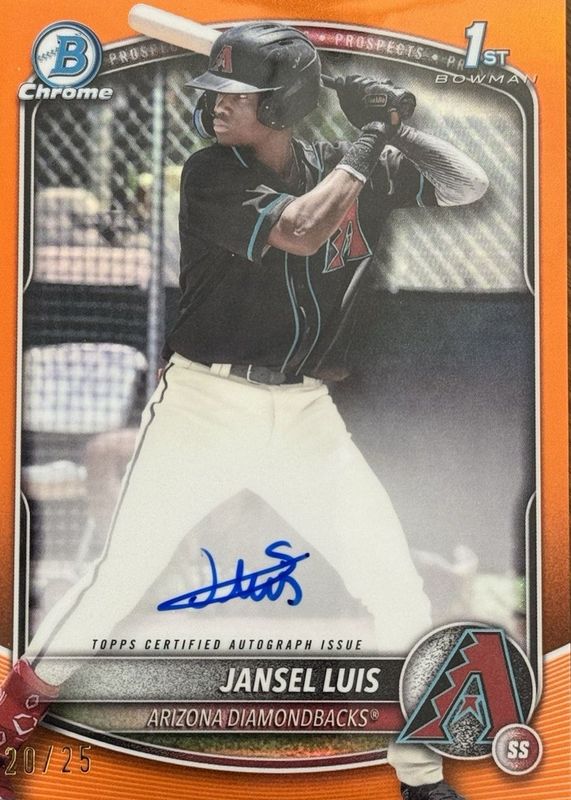 Best Prices Available For Sale of Jansel Luis 2025 Bowman #CPA-JLU Chrome Prospect Auto - Orange Refractor /25 (1st)
