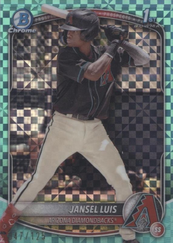 This card is 1 of 88 Jansel Luis' card variations in the 2025 Bowman set being tracked by Sports Card Investor, including Chrome Prospects (1st), Chrome Prospects - Gumball Refractor (1st), Chrome Prospects - Mini Diamond Refractor (1st), Chrome Prospects - Peanuts Refractor (1st), and Chrome Prospects - Pearl Refractor (1st).