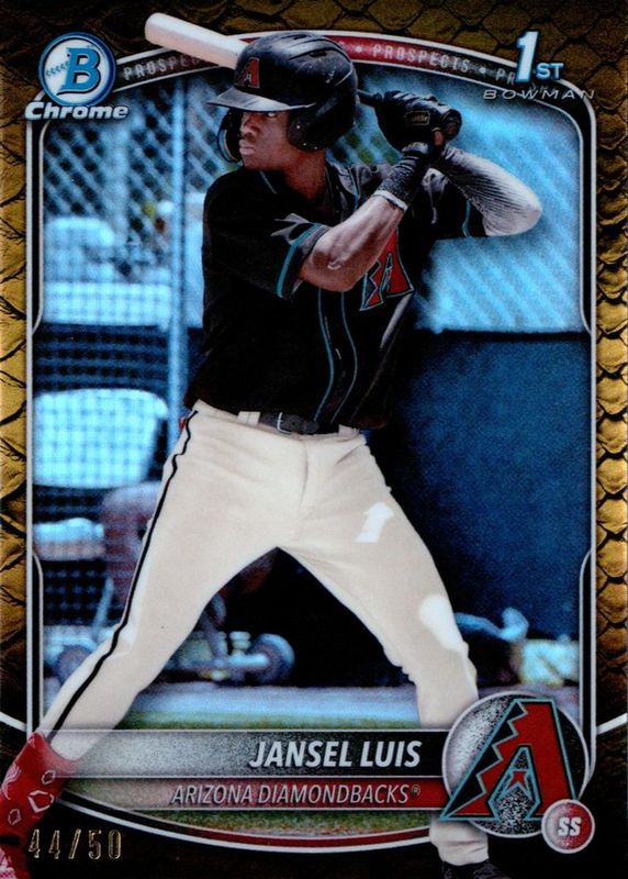 This card is 1 of 88 Jansel Luis' card variations in the 2025 Bowman set being tracked by Sports Card Investor, including Chrome Prospects (1st), Chrome Prospects - Gumball Refractor (1st), Chrome Prospects - Mini Diamond Refractor (1st), Chrome Prospects - Peanuts Refractor (1st), and Chrome Prospects - Pearl Refractor (1st).