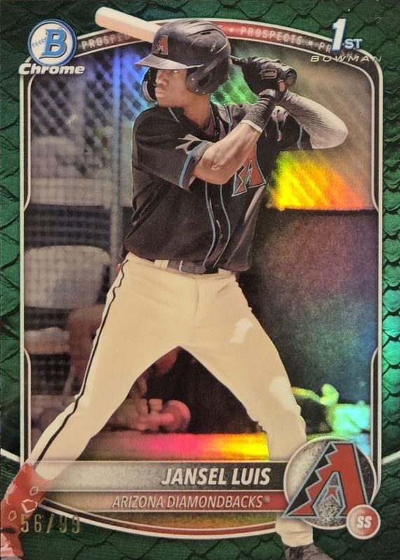 Best Prices Available For Sale of Jansel Luis 2025 Bowman #BCP-84 Chrome Prospects - Reptilian Green Refractor /99 (1st)