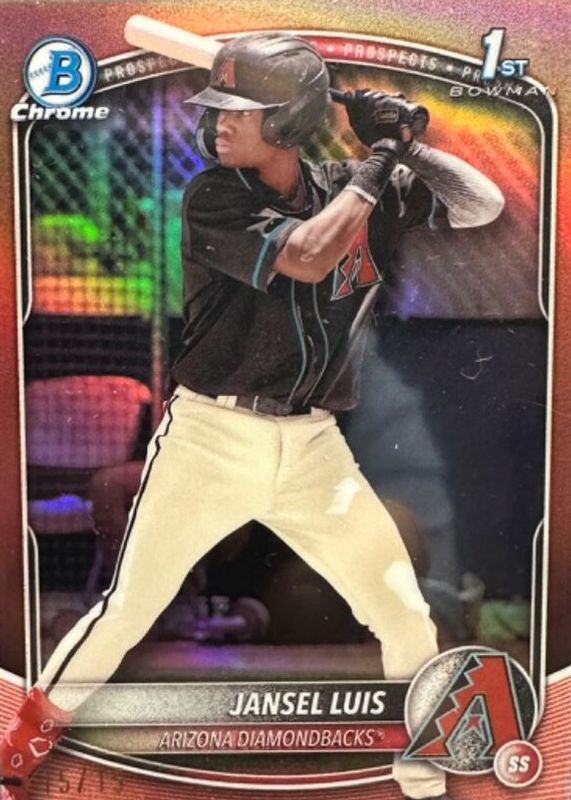 This card is 1 of 88 Jansel Luis' card variations in the 2025 Bowman set being tracked by Sports Card Investor, including Chrome Prospects (1st), Chrome Prospects - Gumball Refractor (1st), Chrome Prospects - Mini Diamond Refractor (1st), Chrome Prospects - Peanuts Refractor (1st), and Chrome Prospects - Pearl Refractor (1st).