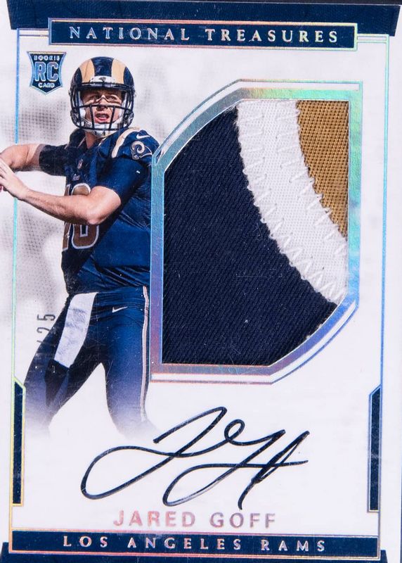 The Jared Goff 2016 National Treasures #101 Rookie Patch Auto - Holo Silver /25 card in Raw condition has not changed in price in the last 30 days and was last sold for $1,726.00 .