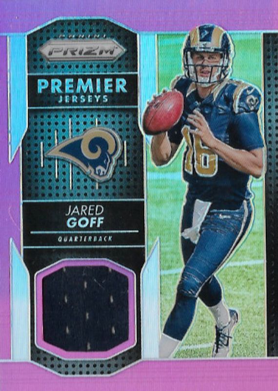 The Jared Goff 2016 Prizm #PPJ-JG Premier Jerseys - Pink Rookie card in Raw condition has not changed in price in the last 30 days and was last sold for $12.35 .