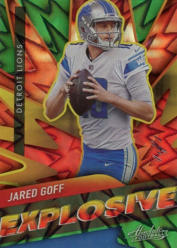 This card is 1 of 3 Jared Goff's card variations in the 2021 Absolute set being tracked by Sports Card Investor, including Explosive /(SSP), and Explosive - Gold /10.