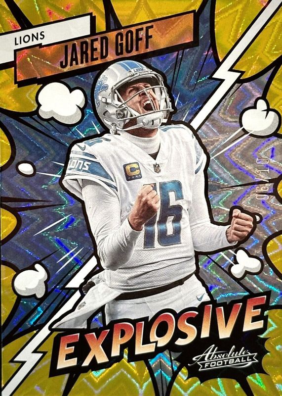 This card is 1 of 6 Jared Goff's card variations in the 2023 Absolute set being tracked by Sports Card Investor, including Kaboom! (Vertical), Explosive /(SSP), Kaboom! (Vertical) - Gold /10, Explosive - Green /1, and Kaboom! (Vertical) - Green /1.