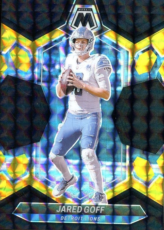 This card is 1 of 50 Jared Goff's card variations in the 2024 Mosaic set being tracked by Sports Card Investor, including Choice Peacock /(SSP), Genesis /(SSP), Honeycomb /(SSP), National Pride - Choice Peacock /(SSP), and National Pride - Genesis /(SSP).