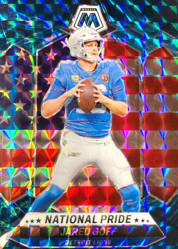 The Jared Goff 2024 Mosaic #252 National Pride - Genesis /(SSP) card in Raw condition has moved up $6.00 (+17.1%) in the last 30 days and was last sold for $41.00 .