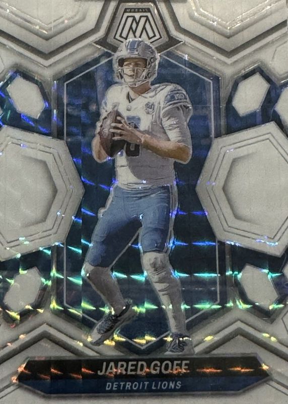 This card is 1 of 50 Jared Goff's card variations in the 2024 Mosaic set being tracked by Sports Card Investor, including Choice Peacock /(SSP), Genesis /(SSP), Honeycomb /(SSP), National Pride - Choice Peacock /(SSP), and National Pride - Genesis /(SSP).