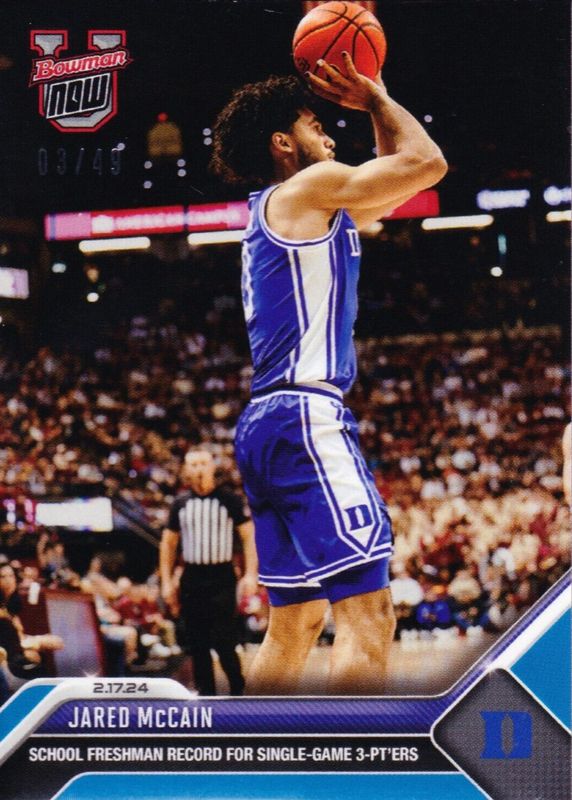 This card is 1 of 6 Jared McCain's card variations in the 2023 Bowman U Now set being tracked by Sports Card Investor, including Base (Print Run: 668), Purple /25, Red /10, Orange /5, and Gold /1.