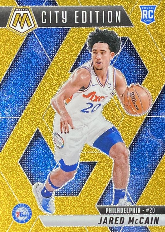 Auctions Ending Soon for Jared McCain 2024 Mosaic #277 City Edition - Gold Glitter /5 Rookie RAW