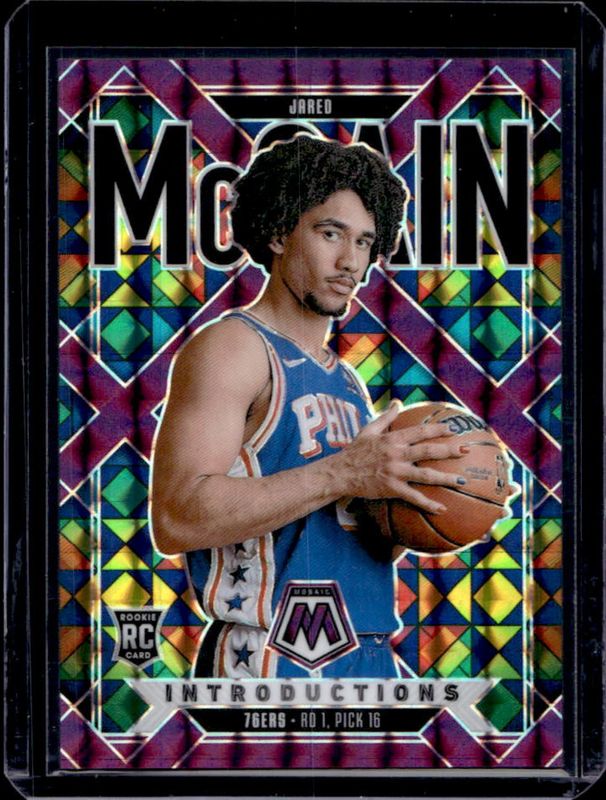 The Jared McCain 2024 Mosaic #1 Introductions - Purple /99 Rookie card is 1 of 429 Jared McCain's card variations in the 2024 Mosaic set being tracked by Sports Card Investor, including Base, City Edition, NBA Debut, Choice Red & Green, and City Edition - Choice Red & Green.