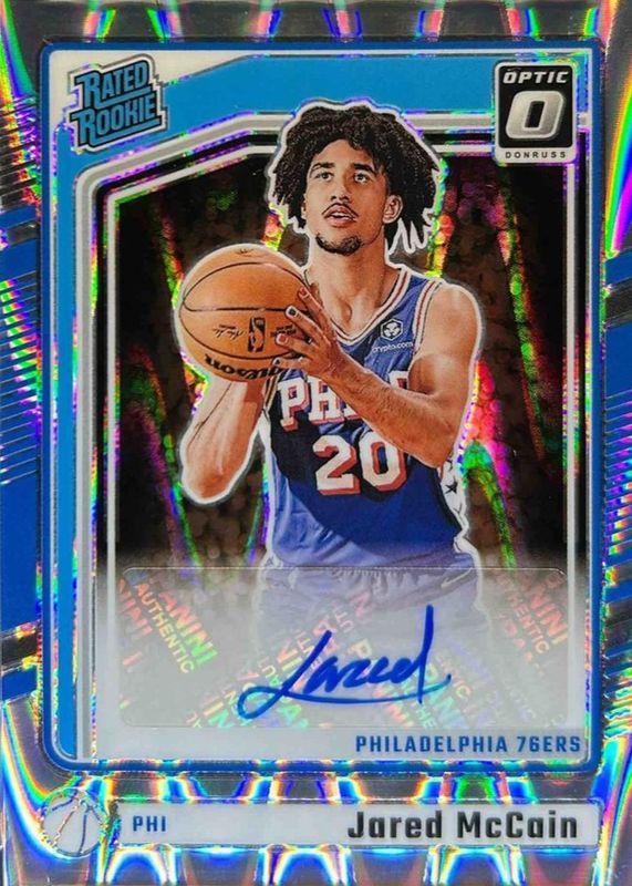 This card is 1 of 195 Jared McCain's card variations in the 2024 Optic set being tracked by Sports Card Investor, including Base, Blue Velocity, Checkerboard, Choice, and Fast Break.
