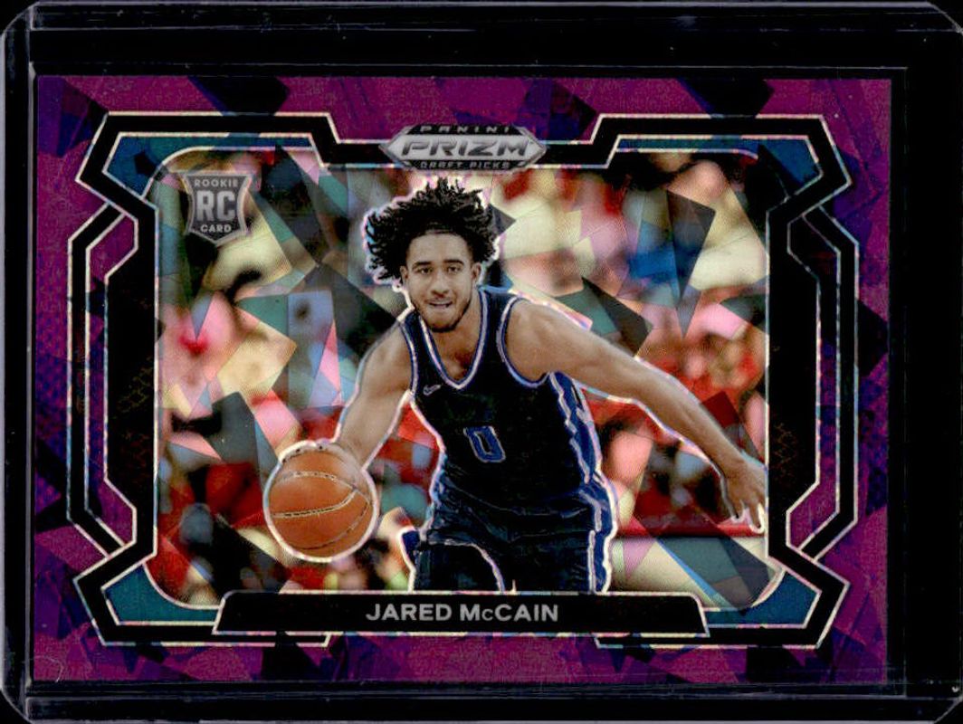 The Jared McCain 2024 Prizm Draft Picks #35b Purple Ice /149 Rookie card is 1 of 203 Jared McCain's card variations in the 2024 Prizm Draft Picks set being tracked by Sports Card Investor, including #35 Base, #35b Base, #35 Variation, #35b Green, and #35 Green.