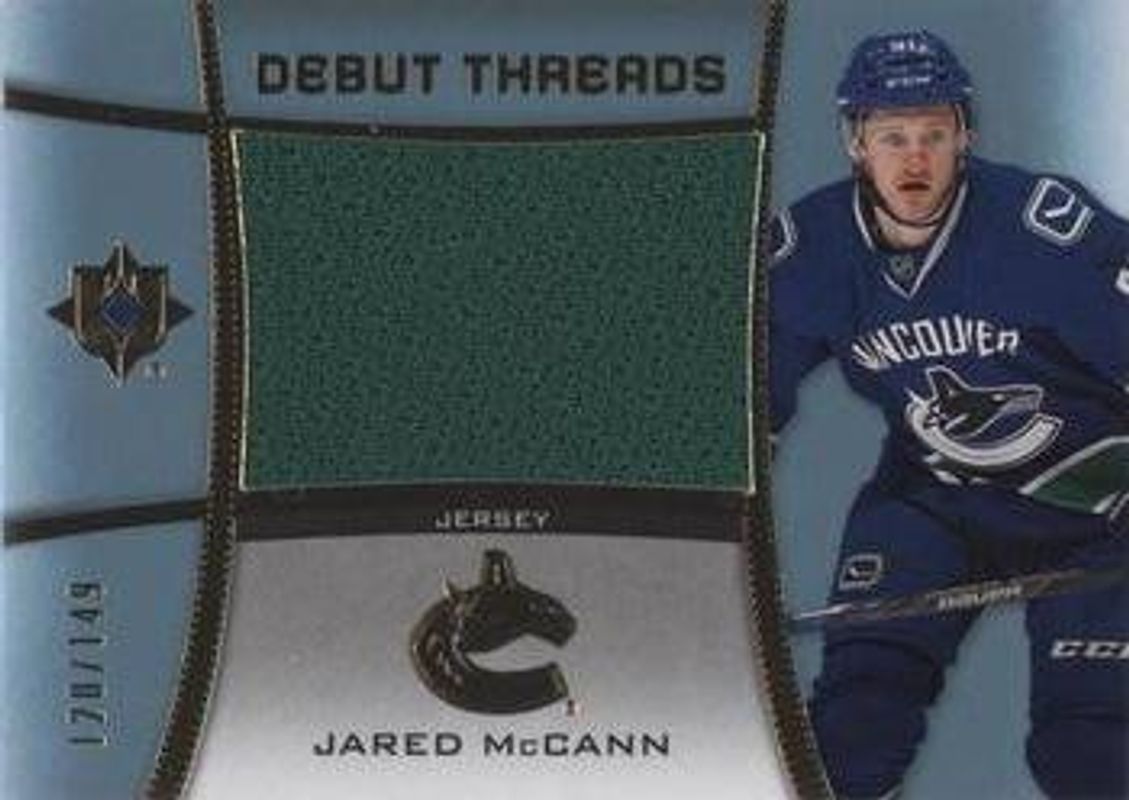 The Jared McCann 2015 Upper Deck Ultimate Collection #DT-JM Debut Threads /149 Rookie card is 1 of 32 Jared McCann's card variations in the 2015 Upper Deck Ultimate Collection set being tracked by Sports Card Investor, including Base /149, Jersey Relics Gold Patch /25, Jersey Relics Spectrum Silver Auto Jersey /25, Jersey Relics Spectrum Gold Auto Patch /15, and Jersey Relics Platinum Blue Relic /5.