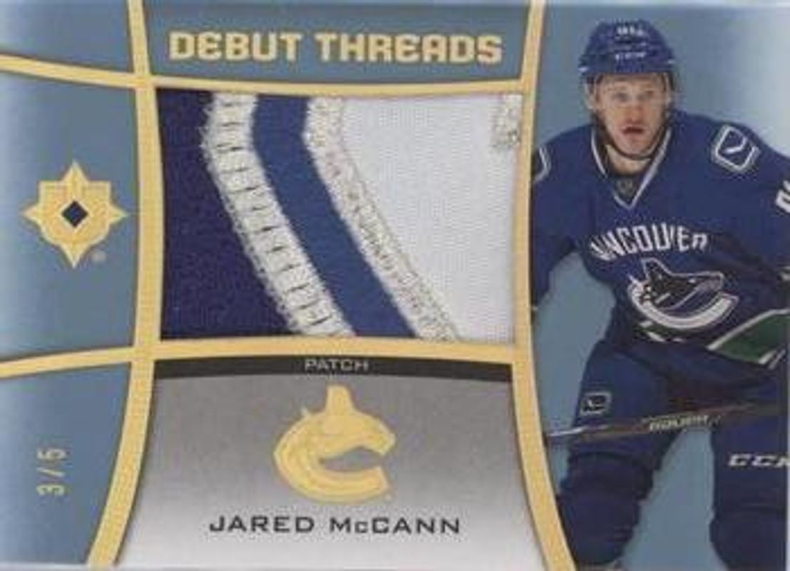 The Jared McCann 2015 Upper Deck Ultimate Collection #DT-JM Debut Threads Patch /5 Rookie card is 1 of 32 Jared McCann's card variations in the 2015 Upper Deck Ultimate Collection set being tracked by Sports Card Investor, including Base /149, Jersey Relics Gold Patch /25, Jersey Relics Spectrum Silver Auto Jersey /25, Jersey Relics Spectrum Gold Auto Patch /15, and Jersey Relics Platinum Blue Relic /5.