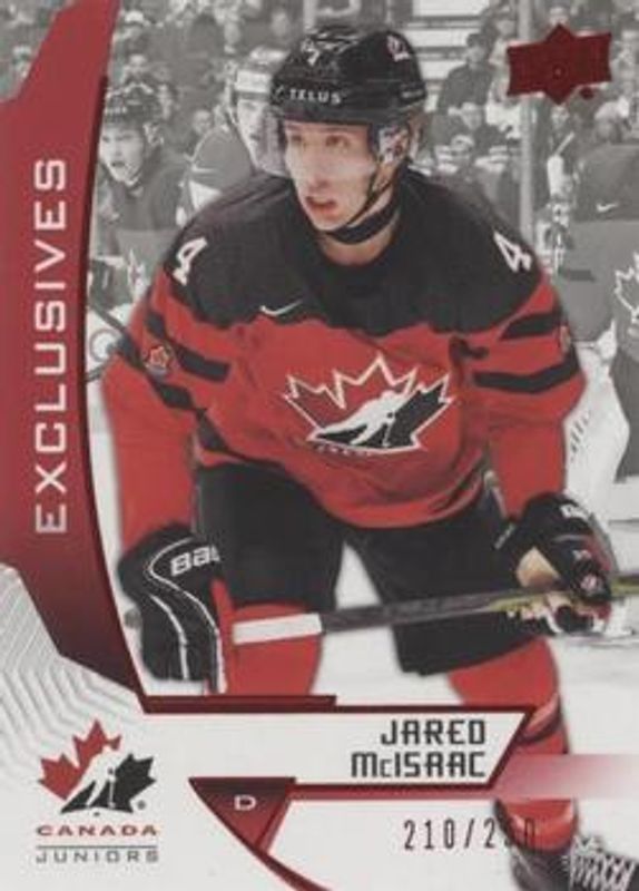 The Jared McIsaac 2019 Upper Deck Team Canada Juniors #33 Exclusives /150 card is 1 of 20 Jared McIsaac's card variations in the 2019 Upper Deck Team Canada Juniors set being tracked by Sports Card Investor, including #33 Base, #111 Base, #33 Jersey Relics, #33 Premium Swatch Autographs /199, and #111 Exclusives /150.