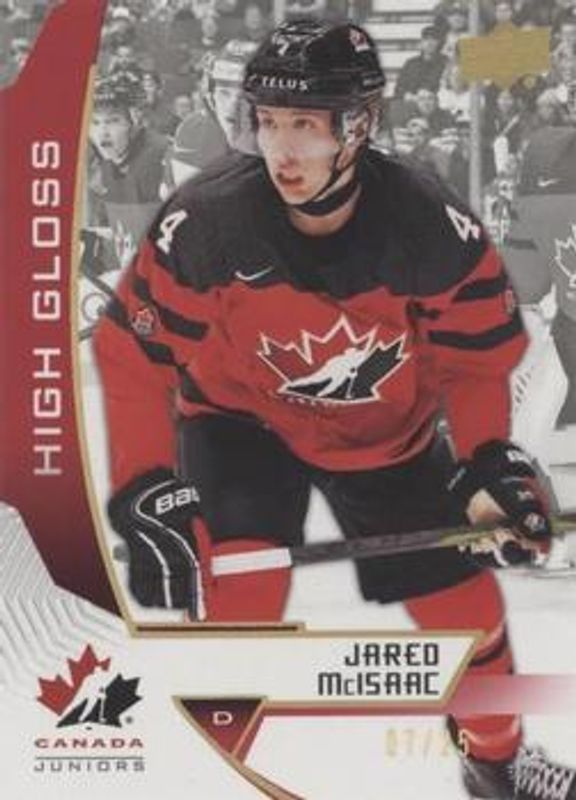 The Jared McIsaac 2019 Upper Deck Team Canada Juniors #33 High Gloss /25 card is 1 of 20 Jared McIsaac's card variations in the 2019 Upper Deck Team Canada Juniors set being tracked by Sports Card Investor, including #33 Base, #111 Base, #33 Jersey Relics, #33 Premium Swatch Autographs /199, and #111 Exclusives /150.