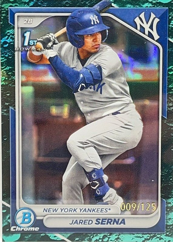 This card is 1 of 55 Jared Serna's card variations in the 2024 Bowman set being tracked by Sports Card Investor, including Chrome Prospects (1st), Chrome Prospects - Lunar Glow Refractor (1st), Chrome Prospects - Mini-Diamond Refractor (1st), Chrome Prospects - Pearl Refractor (1st), and Chrome Prospects - Refractor /499 (1st).