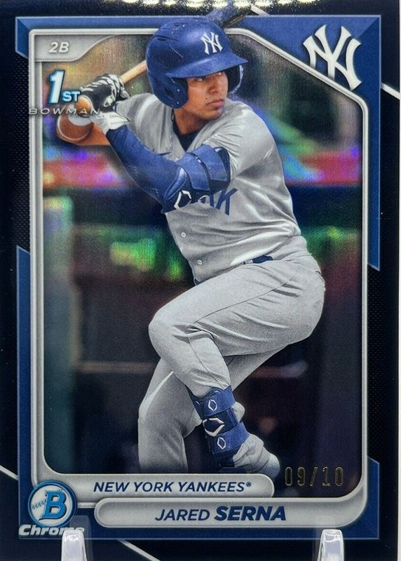 This card is 1 of 55 Jared Serna's card variations in the 2024 Bowman set being tracked by Sports Card Investor, including Chrome Prospects (1st), Chrome Prospects - Lunar Glow Refractor (1st), Chrome Prospects - Mini-Diamond Refractor (1st), Chrome Prospects - Pearl Refractor (1st), and Chrome Prospects - Refractor /499 (1st).