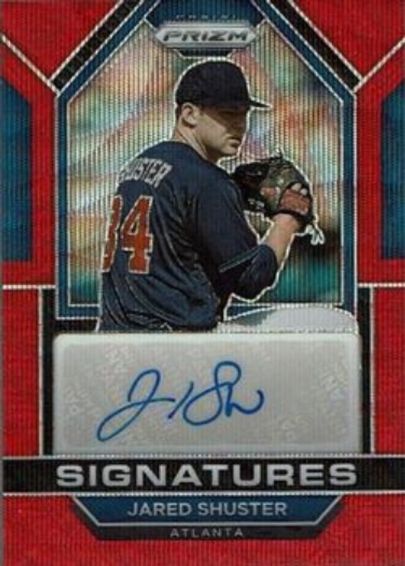 The Jared Shuster 2023 Prizm #SIG-JS Signatures - Red Rookie card is 1 of 44 Jared Shuster's card variations in the 2023 Prizm set being tracked by Sports Card Investor, including Base, Blue Ice, Giraffe, Green Ice, and Hyper.