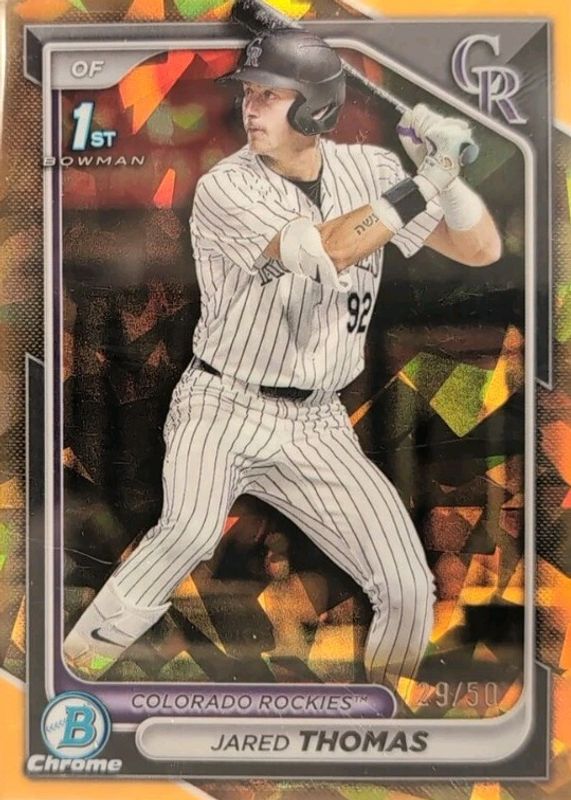The Jared Thomas 2024 Bowman Draft Sapphire Edition #BDC-11 Chrome - Gold /50 (1st) card in Raw condition has not changed in price in the last 30 days and was last sold for $23.73 .