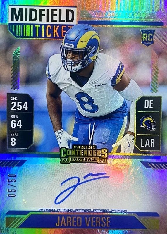 This card is 1 of 26 Jared Verse's card variations in the 2024 Contenders set being tracked by Sports Card Investor, including Rookie Ticket Auto, Rookie Ticket Auto - Opening Kickoff Ticket, Rookie Ticket Auto - Red Zone Ticket, Rookie Ticket Auto - Ticket Stub (/8), and Rookie Ticket Auto Variation.