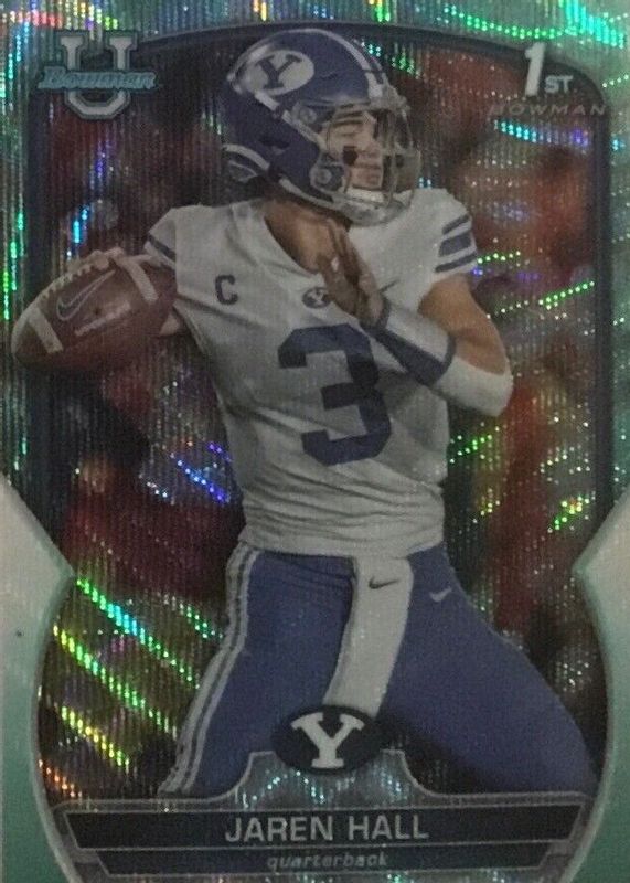 The Jaren Hall 2022 Bowman Chrome University #85 Prospects - Aqua Wave Refractor /299 (1st) card in Raw condition has not changed in price in the last 30 days and was last sold for $2.06 .