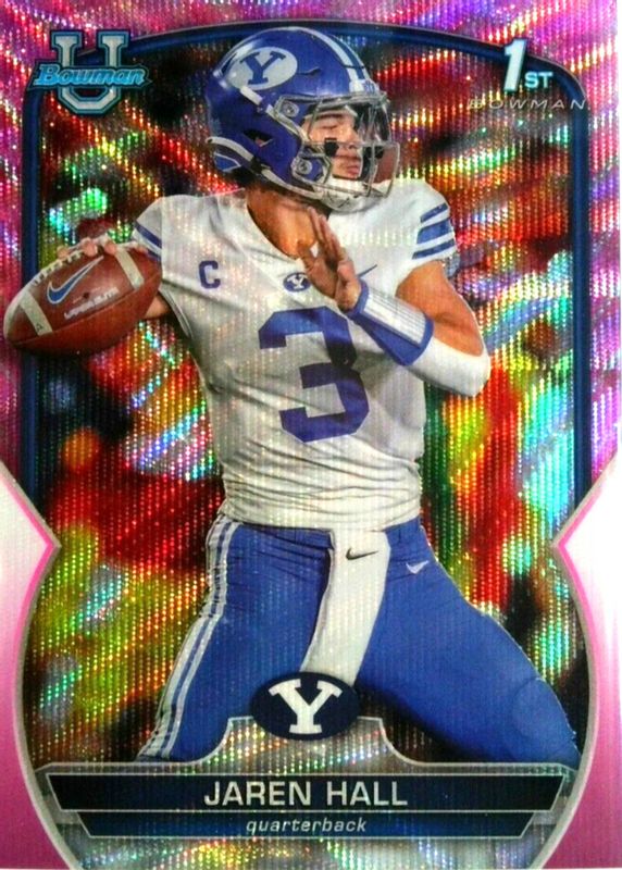 This card is 1 of 38 Jaren Hall's card variations in the 2022 Bowman Chrome University set being tracked by Sports Card Investor, including Prospects (1st), Prospects - Pink Refractor (1st), Prospects - Purple Shimmer Refractor (1st), Prospects - Refractor (1st), and Prospects - SP Variation (Navy Blue Jersey).