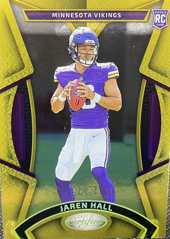 The Jaren Hall 2023 Certified #120 FOTL Mirror Gold /15 Rookie card in Raw condition has not changed in price in the last 30 days and was last sold for $24.95 .