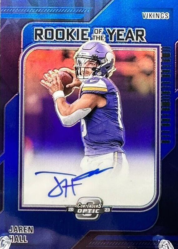 The Jaren Hall 2023 Contenders Optic #ROY-JH Rookie of the Year Contenders Autographs - Blue (/75) card in Raw condition has not changed in price in the last 30 days and was last sold for $3.00 .