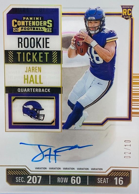 This card is 1 of 29 Jaren Hall's card variations in the 2023 Contenders set being tracked by Sports Card Investor, including Rookie Ticket Auto, Rookie Ticket Auto - Opening Kickoff Ticket, Rookie Ticket Auto - Red Zone Ticket, Rookie Ticket Auto - Ticket Stub (/16), and Rookie Ticket Auto Variation.