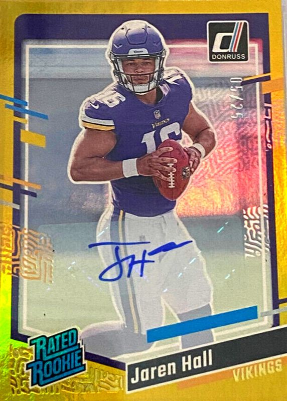 The Jaren Hall 2023 Donruss #367 Rated Rookie Autographs - Gold /25 card in Raw condition has not changed in price in the last 30 days and was last sold for $6.50 .
