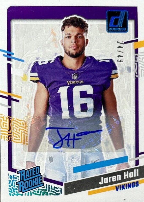 The Jaren Hall 2023 Donruss #40 Rated Rookie Portrait Autographs /49 card in Raw condition has not changed in price in the last 30 days and was last sold for $25.00 .