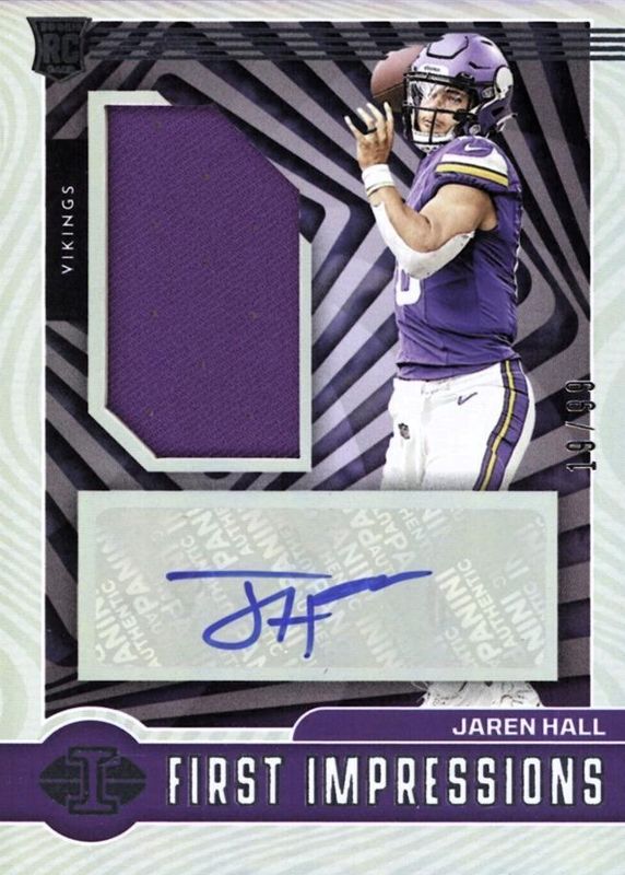 The Jaren Hall 2023 Illusions #116 First Impressions Memorabilia Autographs - Blue /99 Rookie card in Raw condition has not changed in price in the last 30 days and was last sold for $4.25 .