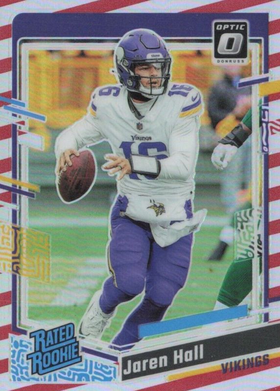 The Jaren Hall 2023 Optic #270 Freedom /(SSP) Rookie card in Raw condition has not changed in price in the last 30 days and was last sold for $5.00 .
