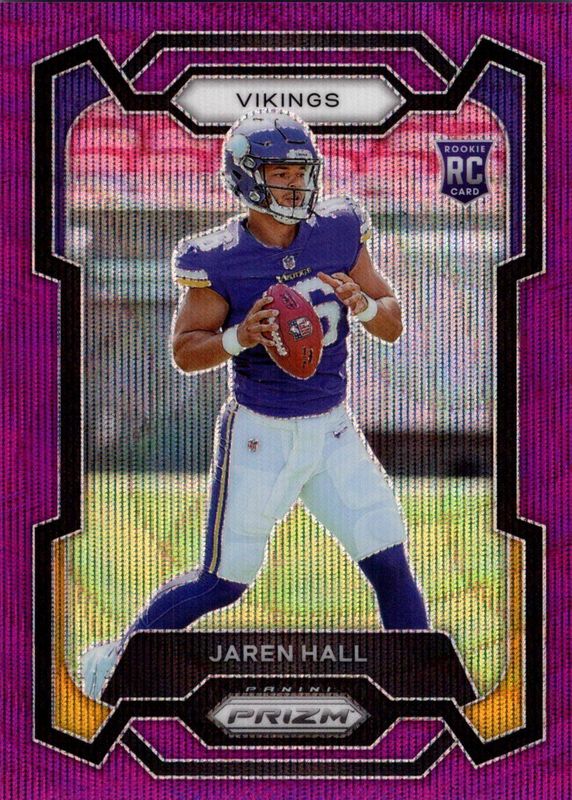The Jaren Hall 2023 Prizm #367 Purple Wave /99 Rookie card in Raw condition has not changed in price in the last 30 days and was last sold for $17.99 .