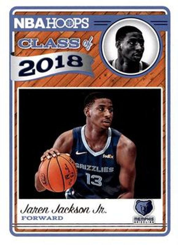 The Jaren Jackson Jr. 2018 Hoops #4 Class of 2018 Rookie card is 1 of 33 Jaren Jackson Jr.'s card variations in the 2018 Hoops set being tracked by Sports Card Investor, including Base, Red Backs, Premium Boxed Set /199, Blue, and Class of 2018 - Holo.