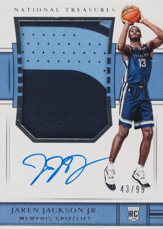 This card is 1 of 8 Jaren Jackson Jr.'s card variations in the 2018 National Treasures set being tracked by Sports Card Investor, including Rookie Patch Auto - FOTL /20, Rookie Patch Auto - Gold /10, Rookie Patch Auto - Emerald /5, Rookie Patch Auto - Blue FOTL /3, and Rookie Patch Auto - Logoman /1.