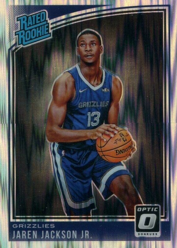 The Jaren Jackson Jr. 2018 Optic #188 Shock Rookie card in Raw condition has moved up $1.25 (+71.4%) in the last 30 days and was last sold for $3.00 .