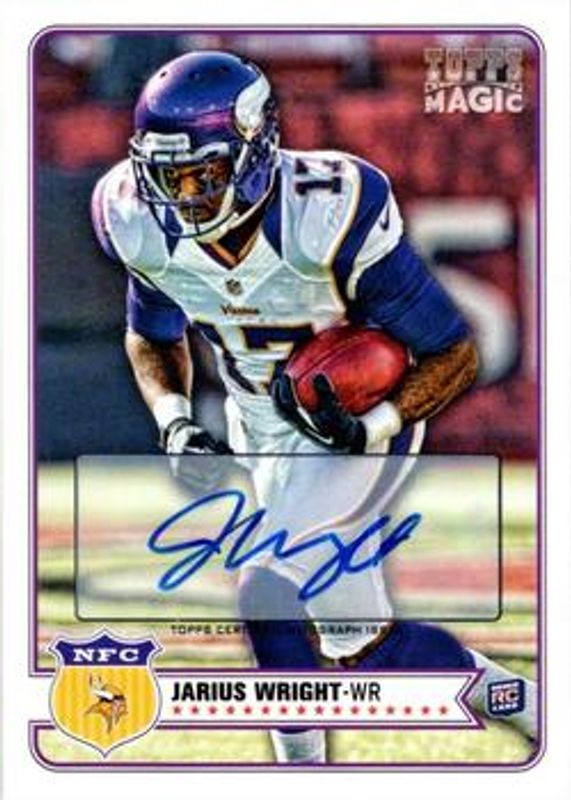 The Jarius Wright 2012 Topps Magic #149 Autographs Rookie card is 1 of 7 Jarius Wright's card variations in the 2012 Topps Magic set being tracked by Sports Card Investor, including Base, Mini, Mini Black Border, Mini Blue Border, and Mini Pigskin 50 /50.