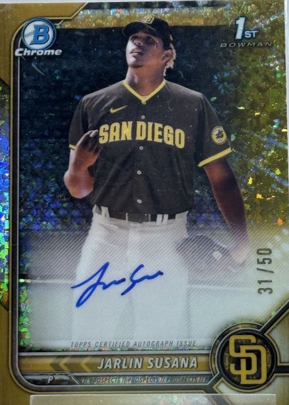 The Jarlin Susana 2022 Bowman Chrome #CPA-JSA Prospect Auto - Gold Mini-Diamond Refractor /50 (1st) card in Raw condition has not changed in price in the last 30 days and was last sold for $68.00 .