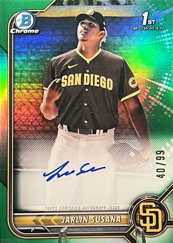 The Jarlin Susana 2022 Bowman Chrome #CPA-JSA Prospect Auto - Green Refractor /99 (1st) card in Raw condition has not changed in price in the last 30 days and was last sold for $80.00 .