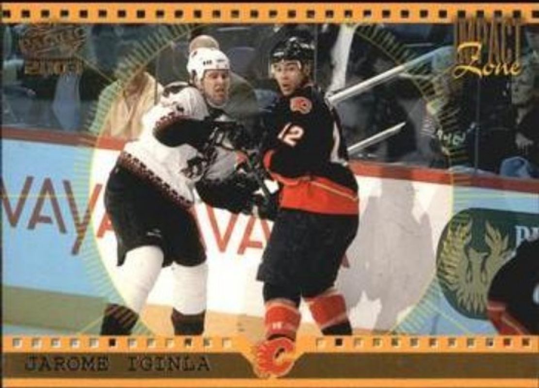 The Jarome Iginla 2002 Pacific #4 Impact Zone card is 1 of 10 Jarome Iginla's card variations in the 2002 Pacific set being tracked by Sports Card Investor, including Base /999, Red, Blue /45, Nights SE /10, and Lamplighters.
