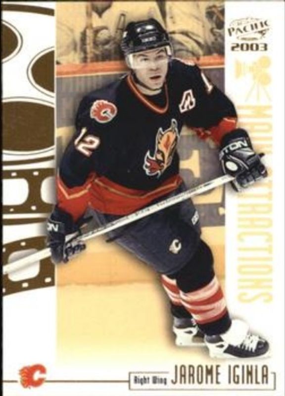 The Jarome Iginla 2002 Pacific #4 Main Attractions card is 1 of 10 Jarome Iginla's card variations in the 2002 Pacific set being tracked by Sports Card Investor, including Base /999, Red, Blue /45, Nights SE /10, and Impact Zone.