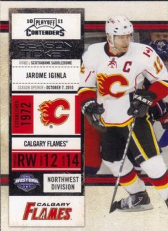 The Jarome Iginla 2010 Contenders #43 Base card is 1 of 5 Jarome Iginla's card variations in the 2010 Contenders set being tracked by Sports Card Investor, including Playoff Tickets /100, Championship Tickets /1, Against The Glass, and Against The Glass Autographs /25.