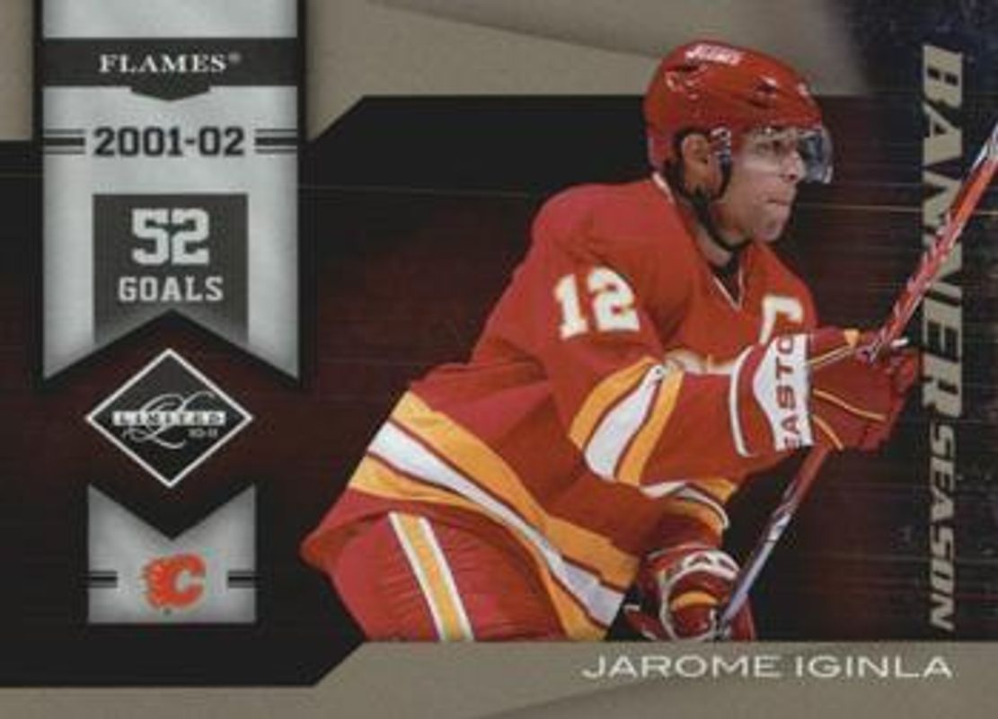 The Jarome Iginla 2010 Limited #11 Banner Season /199 card is 1 of 34 Jarome Iginla's card variations in the 2010 Limited set being tracked by Sports Card Investor, including Base /299, Silver Spotlight /50, Gold Spotlight /10, Platinum Spotlight /1, and Jumbo Materials NHL Shields.